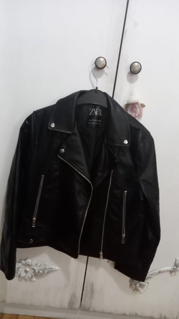 11-12 yaş bir kez kullanıldı 38 beden uyumluSiyah deri biker ceket, çıtçıtlı yaka ve fermuarlı ceplere sahiptir. Orta boy ve normal kesim, günlük sokak stiline uygundur. Marka: ZARA