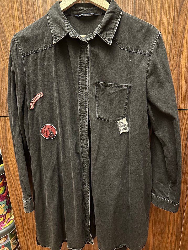 Siyah renkli, düğmeli, uzun kollu denim ceket. Nakışlı detayları ve kesik yakasıyla salaş, midi boyda rahat bir modeldir. #zara #orjinal #yeni #uzun #kotceket iki koltuk arası 60 cm, boy 88 cm.