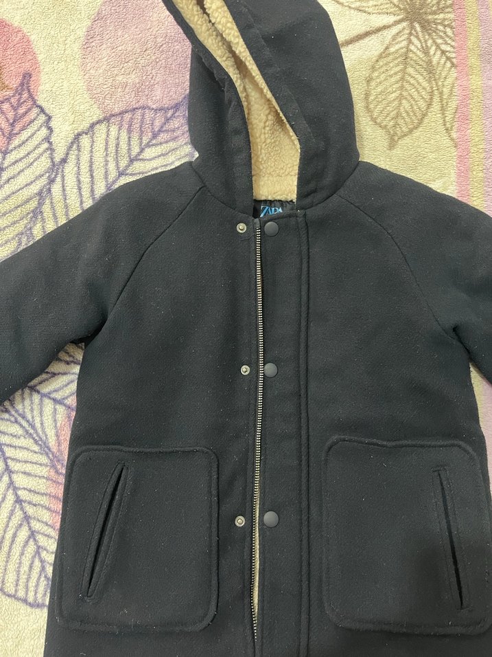 Siyah, kapüşonlu, düğmeli ve içi yumuşak kumaşla kaplı erkek çocuk kabanı. Sokak stili için ideal, yakası notalıdır. Baya kalın ve sıcak tutan bir kaban tertemizdir fazla giyilmeden küçüldü sıfırdan farksız