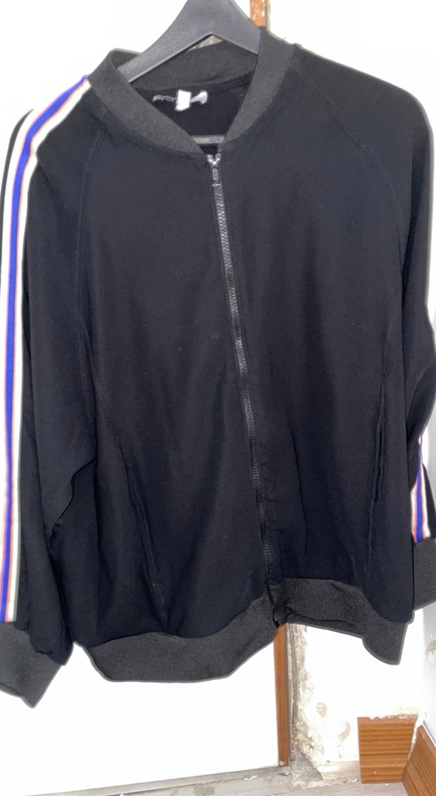 Siyah, fermuarlı, uzun kollu spor ceket. Renkli şerit detaylı, bol kesim ve yüksek yakalıdır. Sentetik kumaştan üretilmiştir. Zara marka m beden