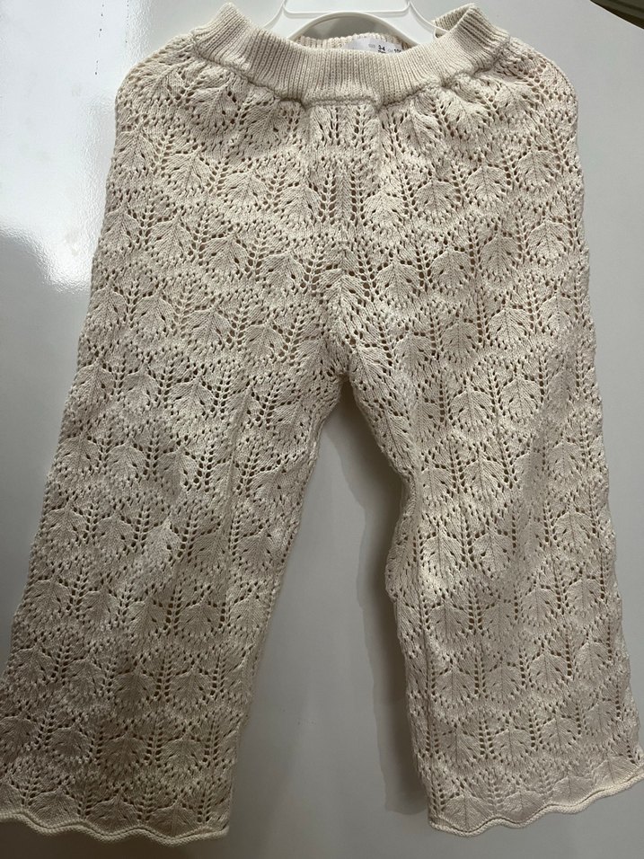 Krem rengi örme kumaştan, bol kesim ve midi boyda, bohem tarzda pantolon. Rahat ve dış mekan kullanımı için uygun.
