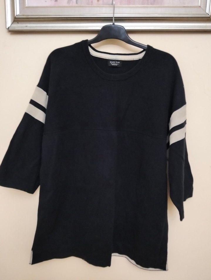 Siyah renkli, beyaz kollu çizgili erkek sweatshirtü, yuvarlak yaka ve 4/3 kolludur. Rahat kesimi ve yumuşak kumaşıyla günlük kullanıma uygundur.