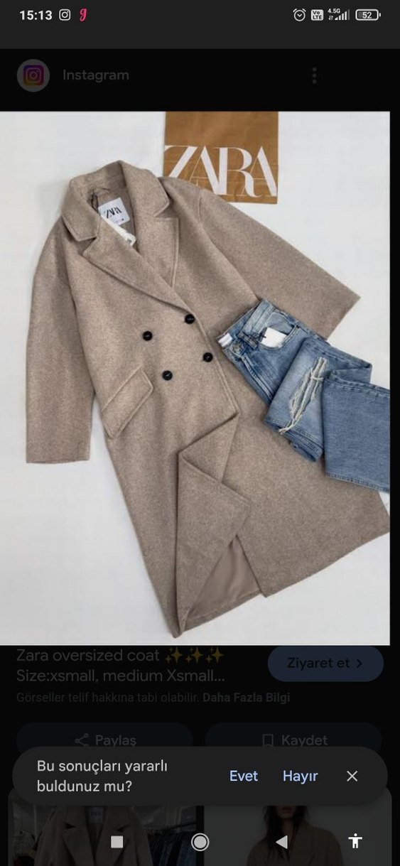 Zara'nın oversized bej kabanı, çift düğmeli tasarım ve yumuşak, sıcak kumaş ile rahat bir kesime sahiptir. Geniş yakalar ve yan cepler içerir. yakında fotoğrafladım gibi hafif tulermesi var jiletle halledilir