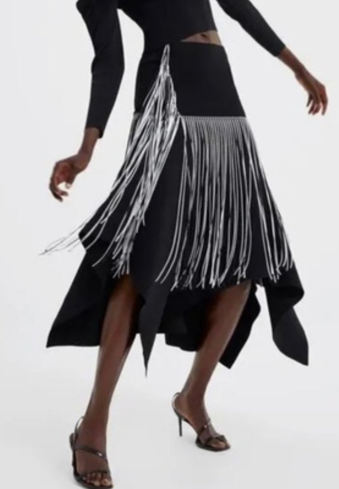 Hiç kullanılmamış özel seri Zara FRINGED ASYMMETRIC KNIT BLACK alt etek ve aynı üstü Geniş kalıptır