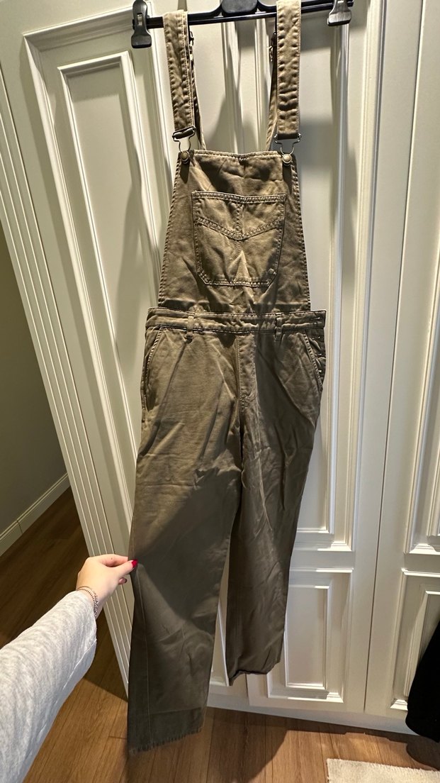 Kadınlar için yeşil keten midi tulum, bol kesim ve düğmeli detaylara sahip. Çentikli yaka ve askılı kollu, günlük rahat sokak stili için uygundur.