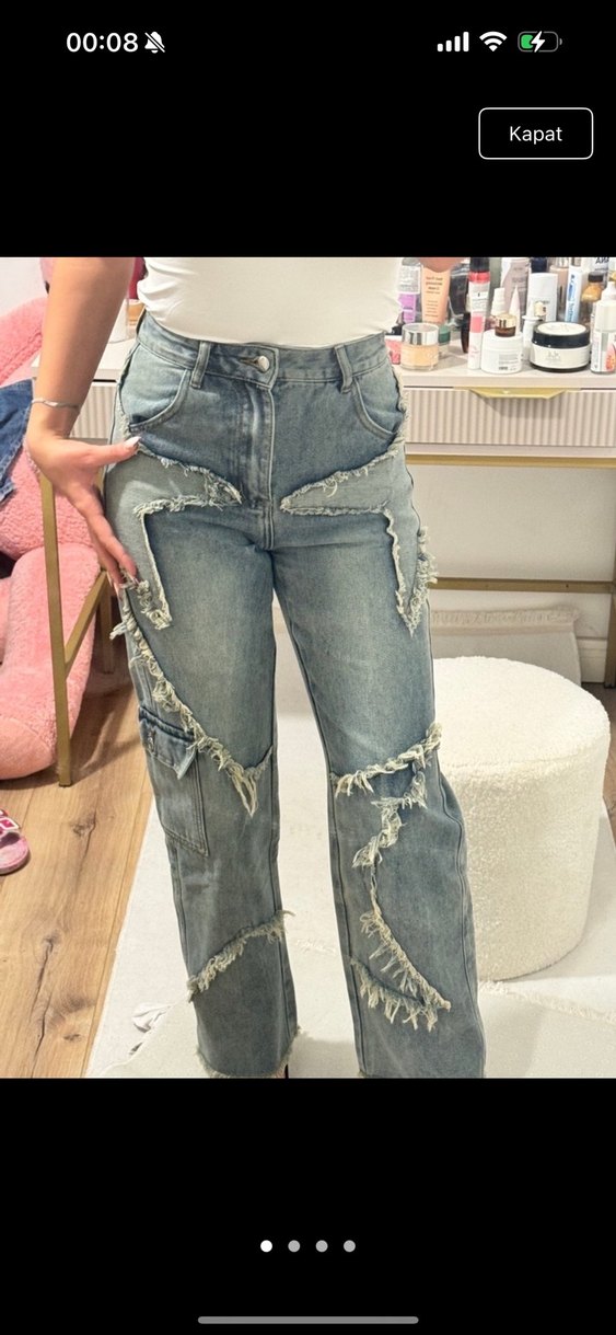 Tokalı, geniş kesim, midi boy mavi kot pantolon. Sokak stiline uygun, gündelik kullanıma uygun, hafif yıpranmış görünümde. Kilo aldığım için satıyorum 2 dead giyildi marks temzilidir yurtdşından aldım