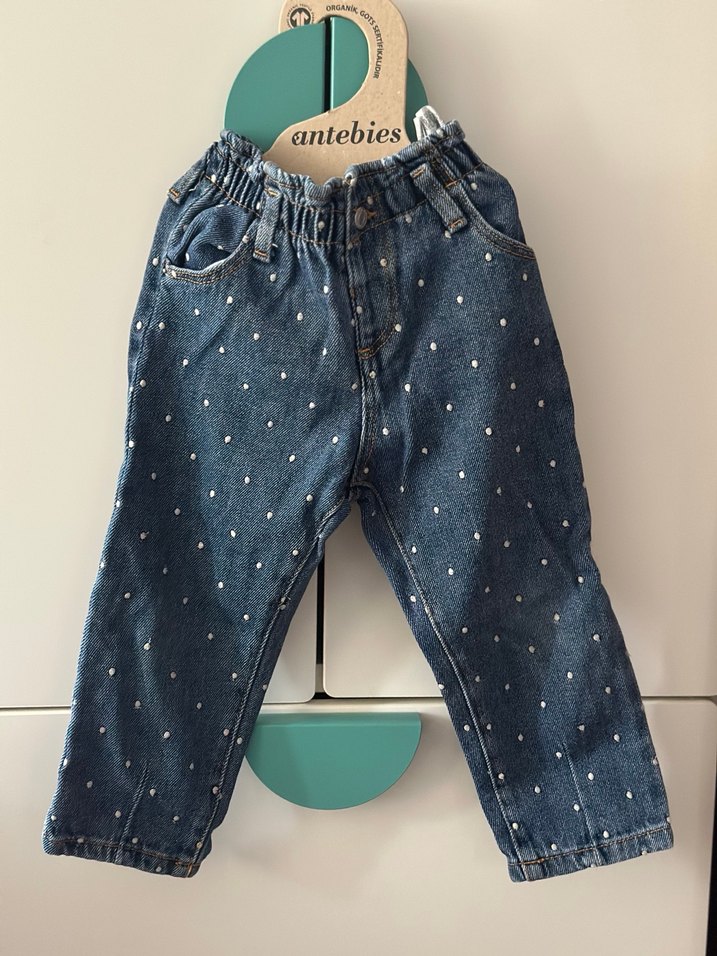 Düğmeli, bol kesim, parlak mavi kot kumaştan kız çocuk pantolonu. İnce benek desenli, rahat normcore tarzda.