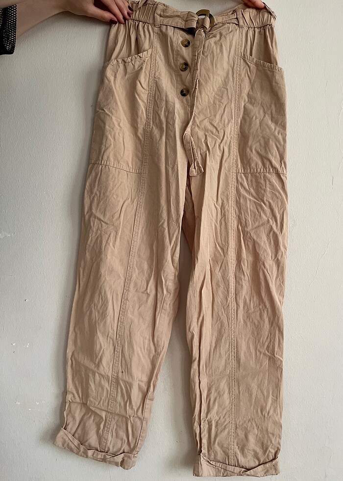 yüksek bel çok ince yapısı var ferah tutuyor havuç pantolon xs ama s bedene olur . çekimde ütülü değil ütülenince çok iyi duruyor kumaşı terletmiyor çok hafif ve yer kaplamıyor bavulda .