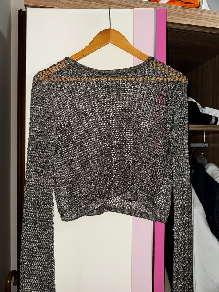 Gri örgü kumaştan, uzun kollu, salaş kesim ve yuvarlak yakalı kadın kazak. Midi boyu ve sade tasarımıyla günlük ve rahat bir görünüm sunar. Çok şık parıltılı