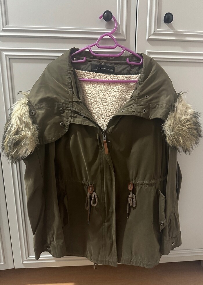 Şapkasındaki ve içinde yünlü kürkü çıkabiliyor çıtçıtlıdır . Herhangi bir sorunu yoktur sadece dirsek arkasında küçük bir leke vardır