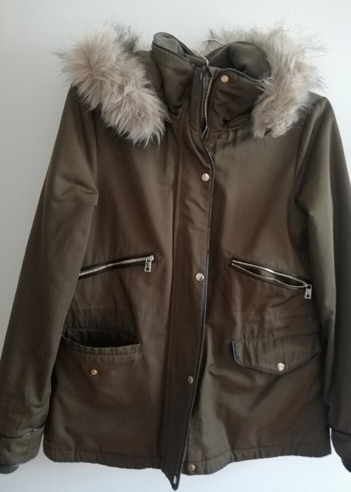 Boy 66cm iki kol altı arası en 51cm. Şapkası takıp çıkarılabiliyor. Kolundaki ve fermuar yanındaki deri şeritlerde hafif soyulmalar var görsellerde mevcut. Arkası büzülebiliyor. Parka model