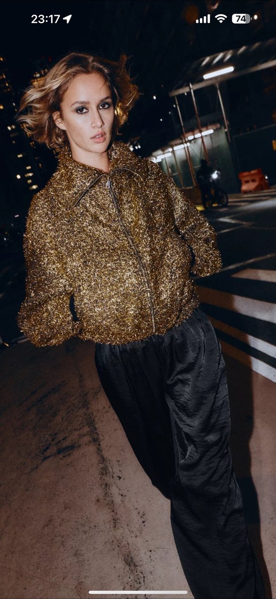 Orjinal, sıfır, etiketli ürün #zara Kadınlar için bol kesim, parlak altın renkli sentetik kumaştan, kürk detaylı bomber ceket. Uzun kollu, yakası kesik ve parti ile sokak stili için uygun. ✨