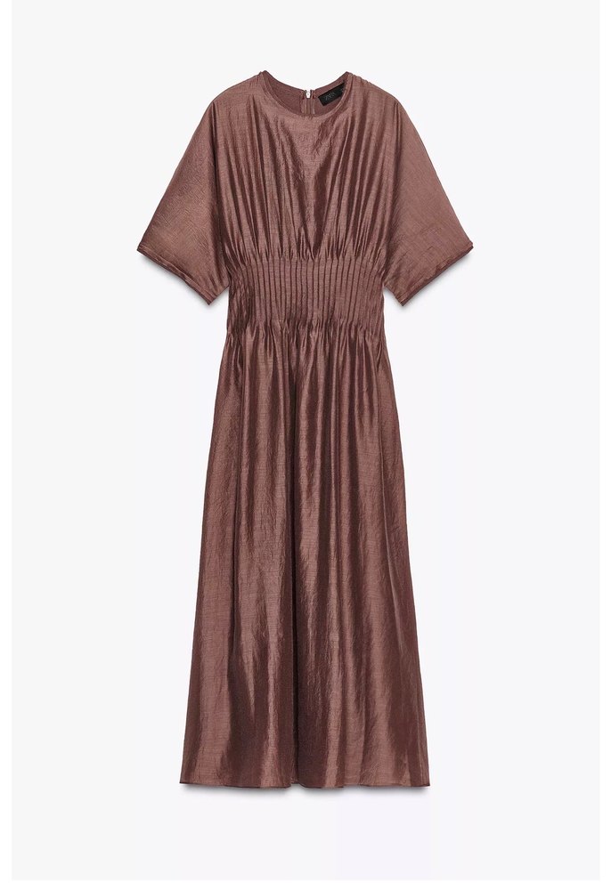 Parlak görünümlü, keten kumaştan uzun bej elbise. Kısa kollu, pilili ve bol kesim, yuvarlak yakalıdır. Minimalist ve çağdaş tarz için uygundur.
