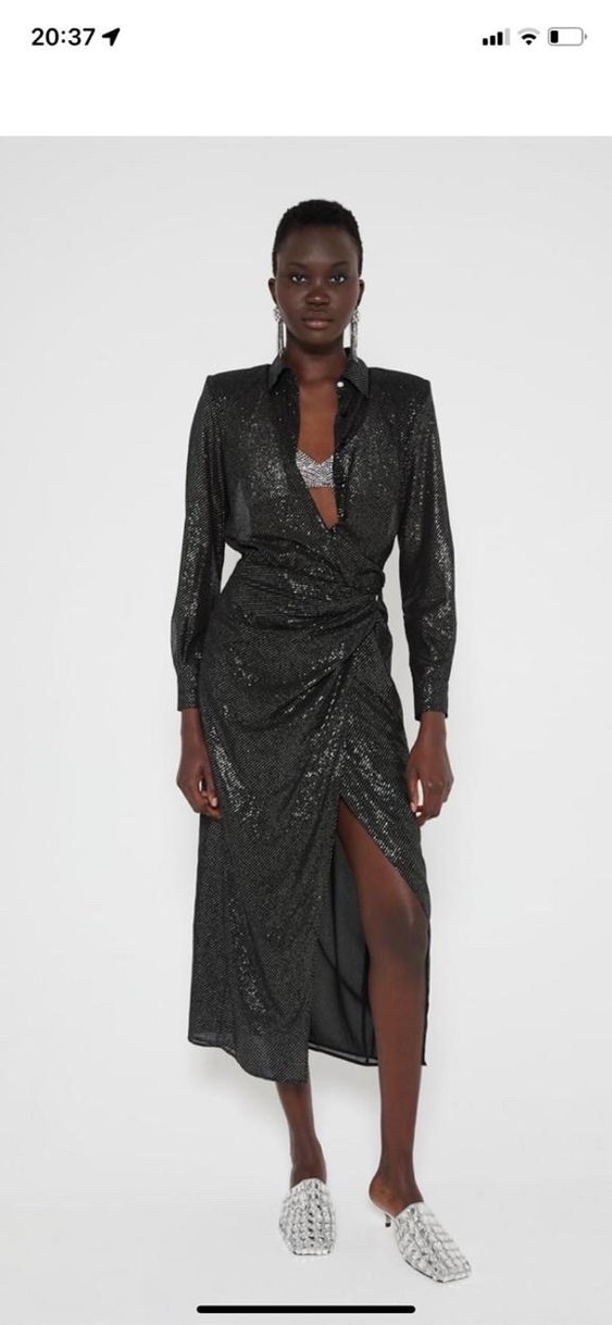 Önü patletle gizlenen düğmeli, astarlı, kenarı önden yırtmaçlı, parlak taş düğmeli ve büzgülü kruvaze kesim, uzun kollu, yakalı midi elbise. Son fiyattır