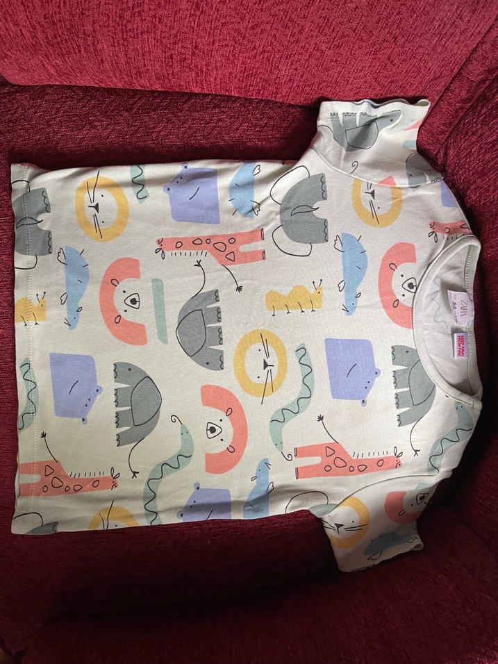 Zara pastel renklerde baskılı, yumuşak pamuklu kumaştan yazlık takım. 4-5 yaş, bluzda belli belirsiz bir leke var, yüksek ısıda çıkacağını düşünüyorum.