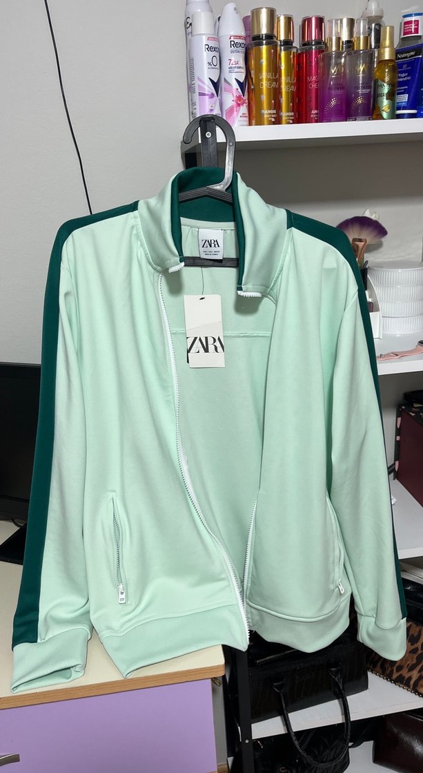 Zara marka, pastel yeşil renkli, koyu yeşil şerit detaylı, uzun kollu, fermuarlı ve yüksek yakalı kadın ceketi. Rahat ve bol kesimdir, günlük kullanıma uygundur.