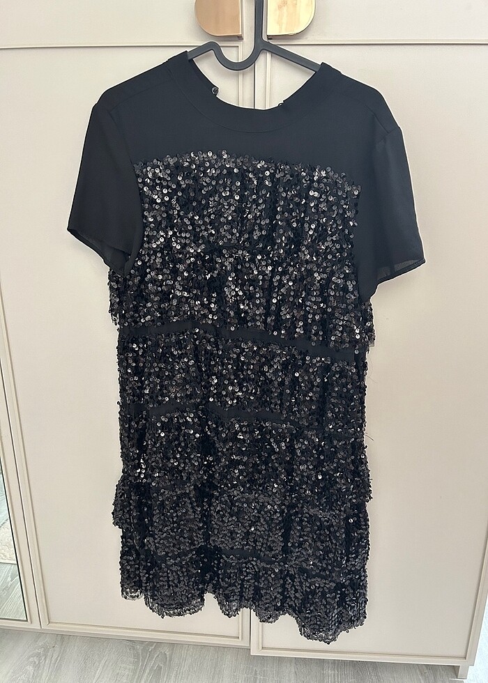 Hiç kullanılmadı. 165 boy için dizin üzerinde bir boyu var. Dökümlü, bol inen bir elbise.