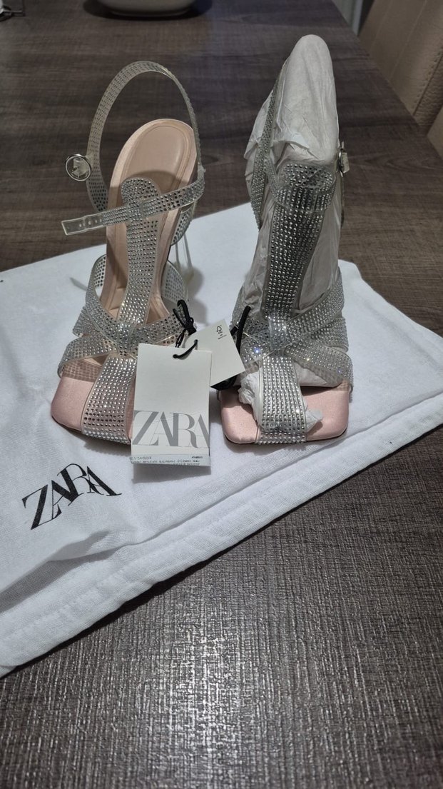 Zara kadın abiye ayakkabı, ince topuklu, pembe baskılı sentetik kumaş ve payetli detaylara sahip. Düğünler için şık ve gösterişli. Orijinal etiketli, Zara toz torbası ile.