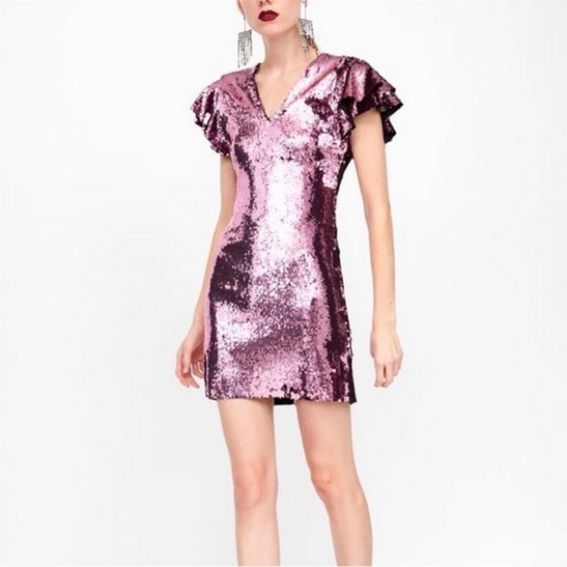 Zara marka pembe pullu payetli mini elbise. Sadece bir kez giydim. Esnek bir kumaşı var vücudunuzun şeklini alıyor.