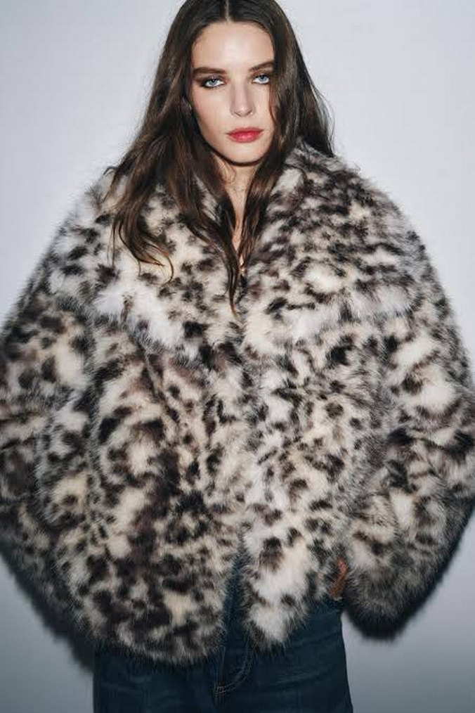 Gri tonlarda leopar desenli, bol kesim, suni kürk kadın ceketi. Notch yakalı, rahat ve retro tarzda, günlük kullanım için uygundur.