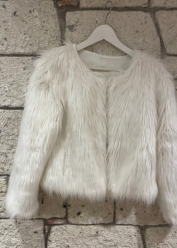 Beyaz tüylü kürk .kaliyeli tüyleri. astarlı yandan cepli önden kancayls kapanıyor yeni sorunsuz. Tertemiz kürk hiç giyilmedi ihtiyaç fazlası arkasındaki tüylerin yatık durması resim çekerken yatmış bir sorunu yok yeni