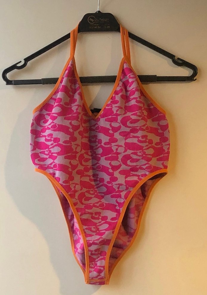Zara pembe bağlama desenli, strappy askılı ve dantel detaylı, midi boy, vücuda oturan kadın mayo, plaj kullanımı için uygun.