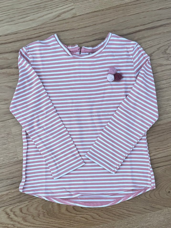 Zara Pembe/Beyaz Denizci Çizgili Tişört 2-3 Yaş (98 cm). Uzun kollu, bisiklet yaka tişört, ponpon detaylı. %100 pamuk.