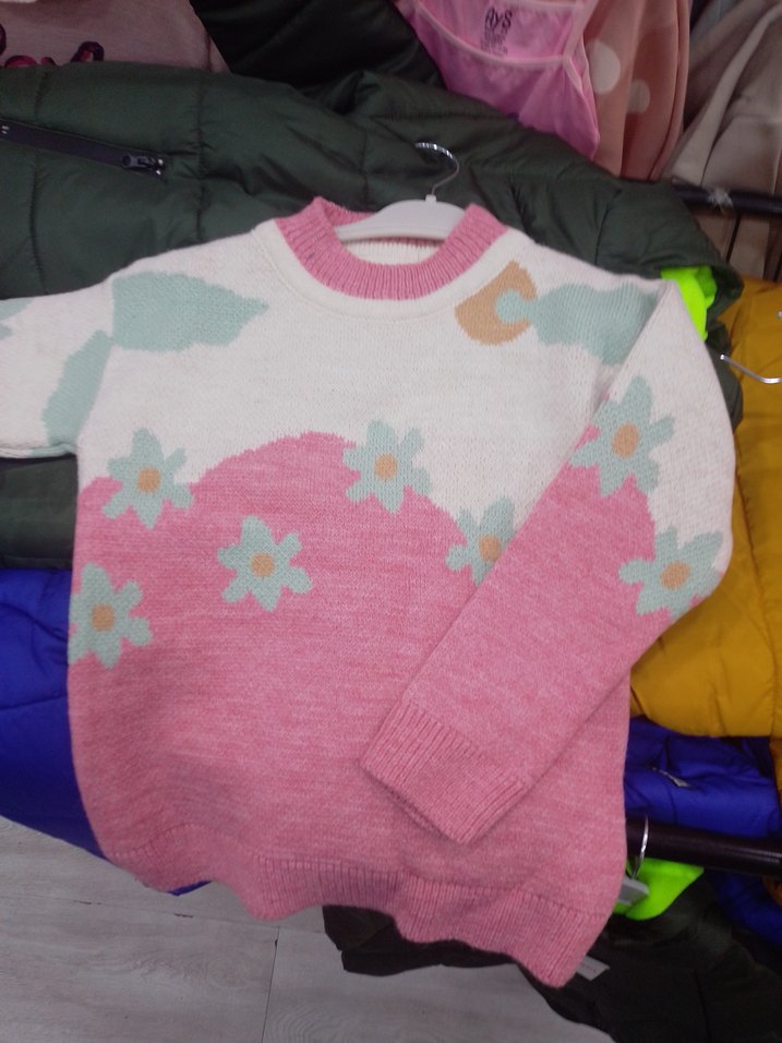 Zara Pembe renkli, uzun kollu ve bisiklet yaka örgü kazak. Pastel tonlarda çiçek desenleriyle süslenmiş, rahat ve salaş kesimlidir.8 yaş