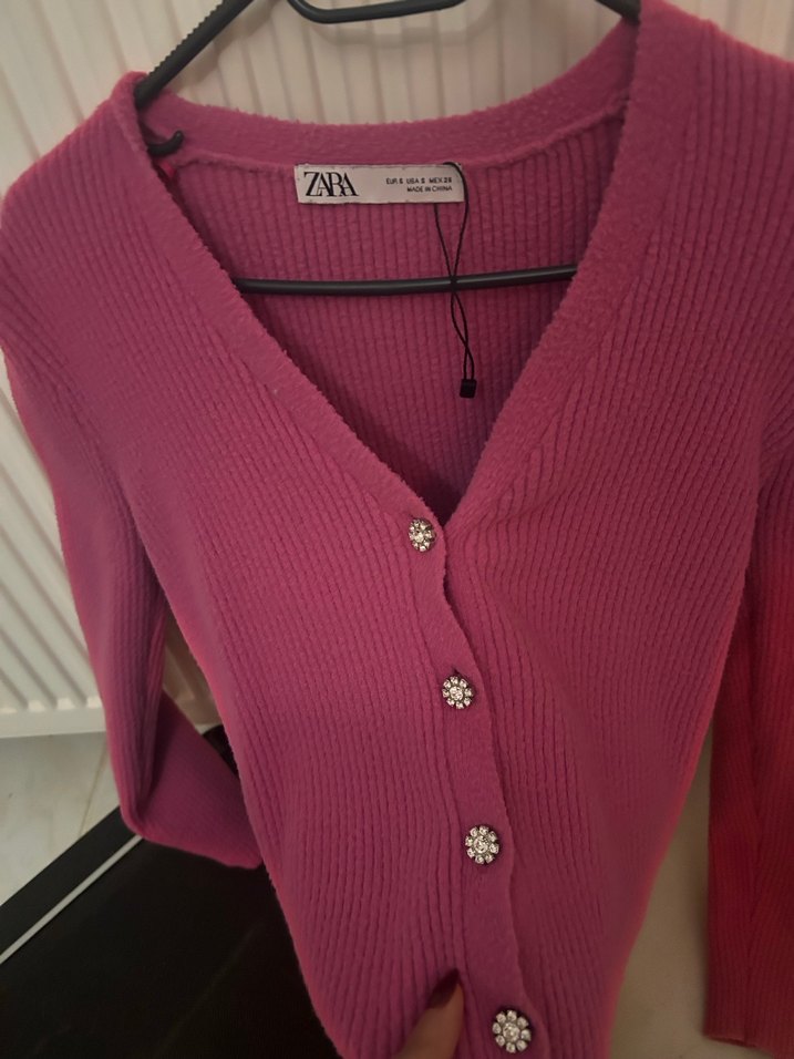 Zara marka, düğmeli, V yakalı, uzun kollu, pembe, midi boy, yumuşak trikodan yapılmış dar kesim hırka. Rahat sokak stili için uygundur.