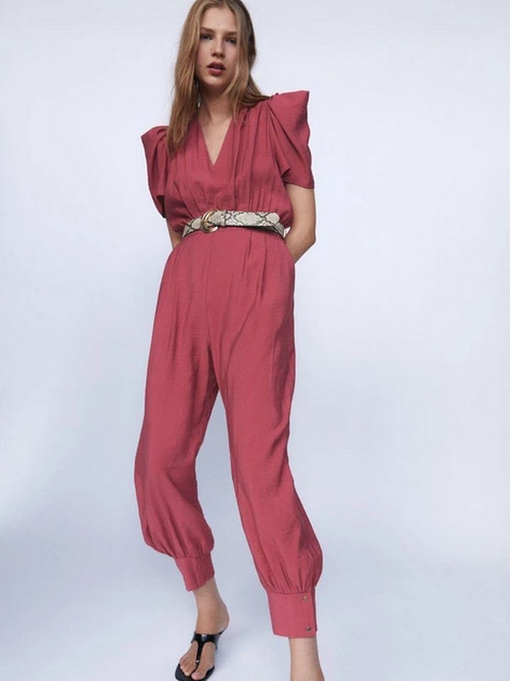 Pembe keten kumaştan, V yakalı ve askılı kollu, kemerli bel ve midi boyda, rahat kesim tulum. Bir kez giyildi. XS 34 bedendir.