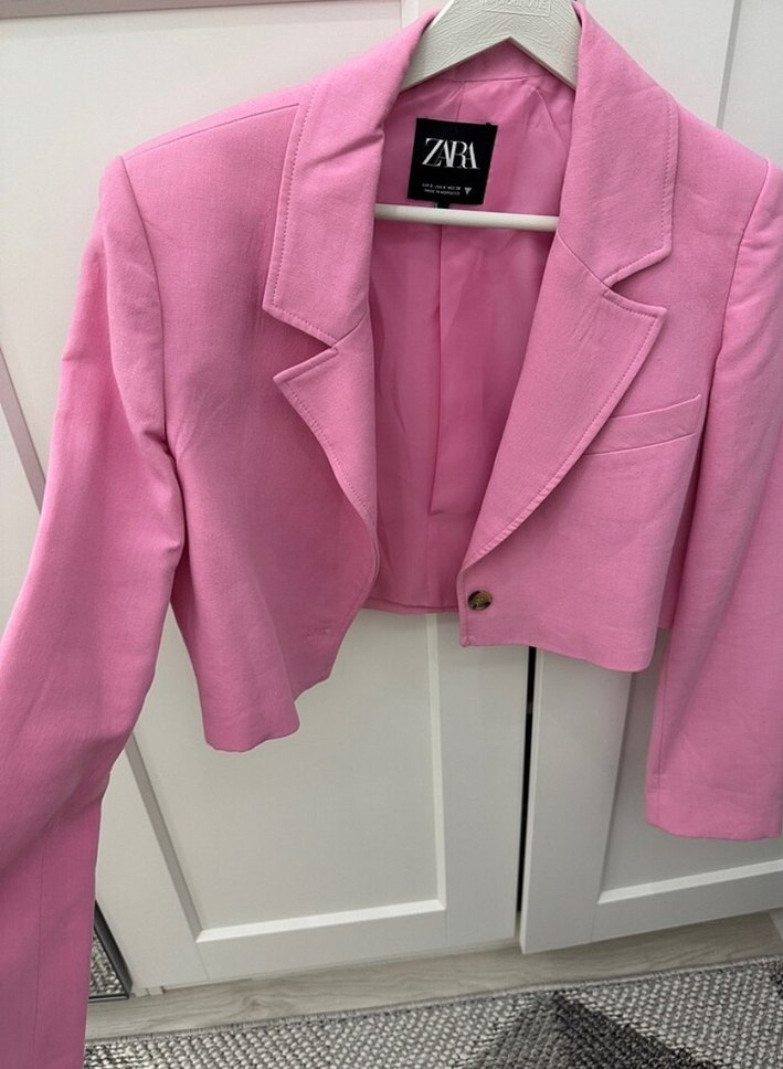 Pastel pembe renkli keten mini blazer, düğmeli ön ve kesik yaka detaylarına sahiptir. Uzun kollu, dar kesimdir ve kısa boydadır, günlük rahat stil için uygundur.