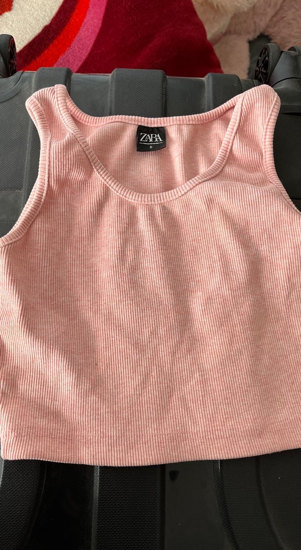 Zara markalı, pembe renkte, kolsuz ve fitted kesim kız çocuk crop top. Yumuşak sentetik kumaştan üretilmiş, rahat ve şık bir parça.