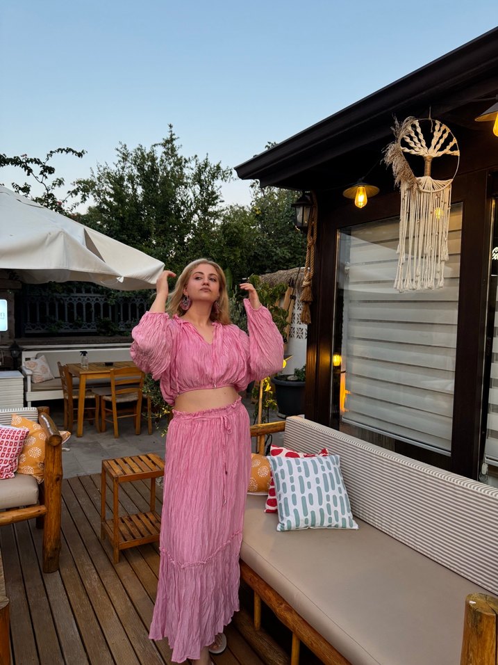 Pembe tonlarında pastel, piliseli ve uzun kollu, bol kesim bohem elbise. İpek gibi yumuşak kumaştan, tekne yaka detaylı, parti için uygun. Bi kere giyildi