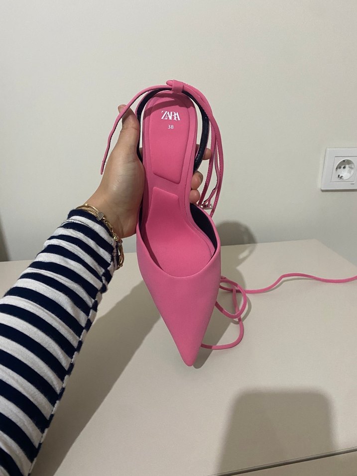 Zara'dan elastik bantlı, sivri burunlu pembe kısa topuklu ayakkabı. Pastel renk şık bir sokak tarzı sunar. Günlük kullanım için uygundur.