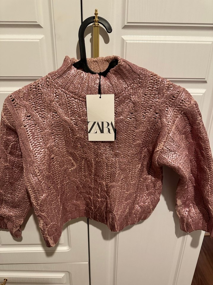 Zara markalı, pembe renkli, örgü mini triko kazak. Uzun kollu, yuvarlak yaka ve bol kesim detaylarıyla rahat ve şık bir görünüm sunar. #zara