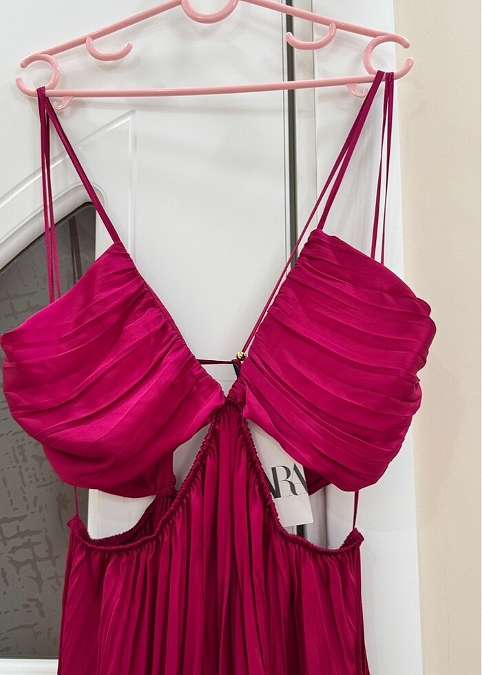 Zara buruşuk görünümlü pencere detaylı uzun elbise. Sırtı altın boncuklu, ince askılı, V yaka, saten yüzeyli elbise. Yırtmaçlı, elastik bel. Kırışık efektli kumaş detaylı #yeni#etiketli#pencere#detaylı#uzun#midi#elbise#zara#fuşya#pembesi#renkli