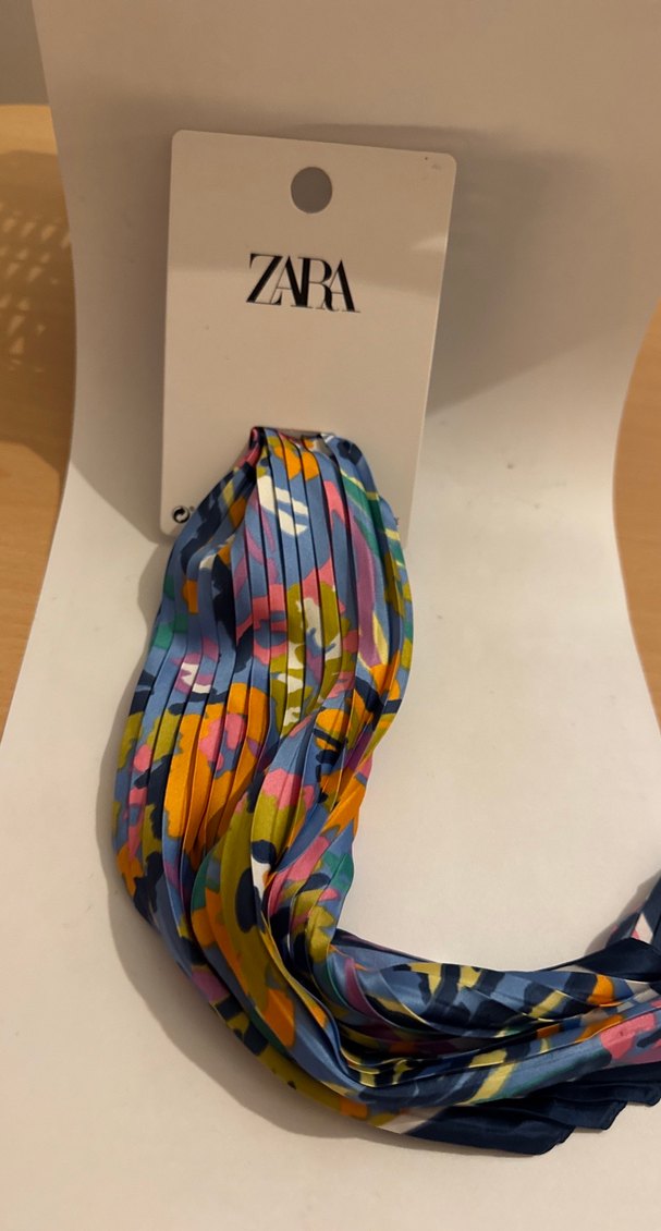 Zara markalı, çok renkli desenli pileli kadın fular. Yumuşak sentetik kumaştan üretilmiş, bohem ve avangart tarzda.