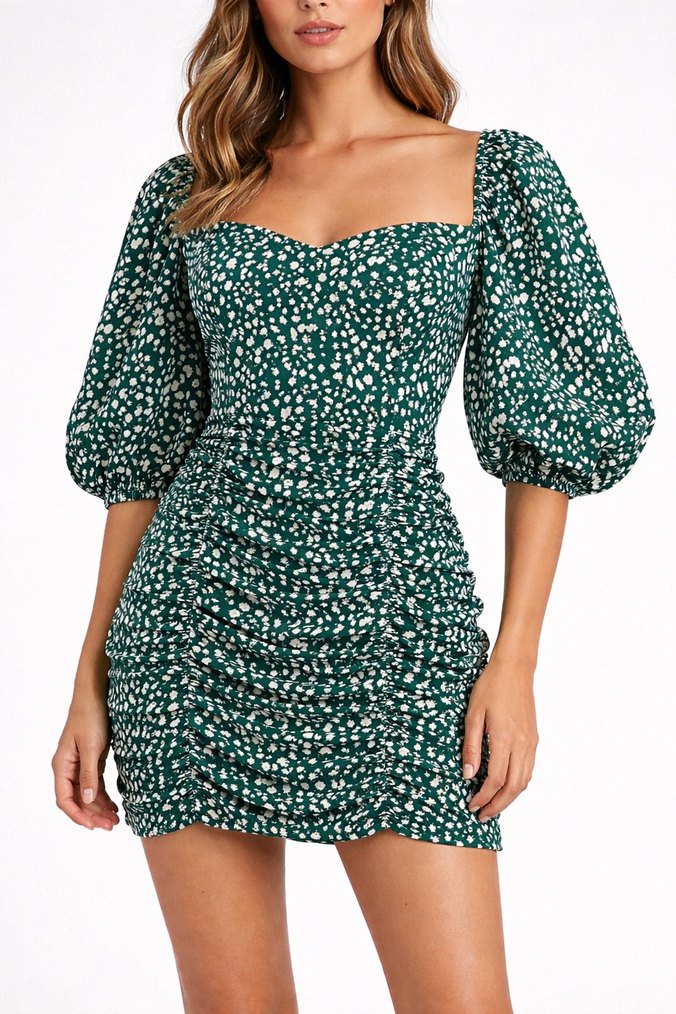Marka temsildir ve kısa balon kollu, pileli detaylı, koyu yeşil puantiyeli mini elbise. Romantik akşamlar için uygun.