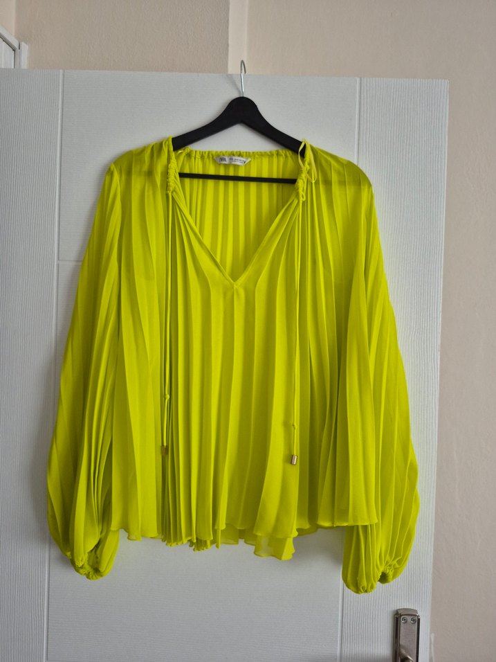 Sarı piliseli bluz, uzun ve bol kollu, V yakalı, yumuşak sentetik kumaştan yapılmıştır. Kısa boyu bohem tarzına uygundur.