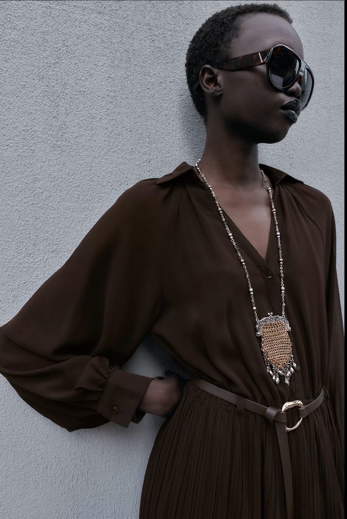 Zara Kahverengi bohem uzun elbise, yakalı ve uzun kolludur. Rahat kesimi, etnik deseni ve zincir detaylarıyla ipeksi kumaştan üretilmiştir.