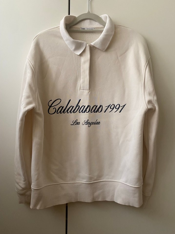 Pamuklu, beyaz renkli, uzun kollu, polo yaka ve düğme detaylı, bol kesim kadın sweatshirt. Önünde "Calabasas1991 Los Angeles" baskısı vardır. İyi durumda