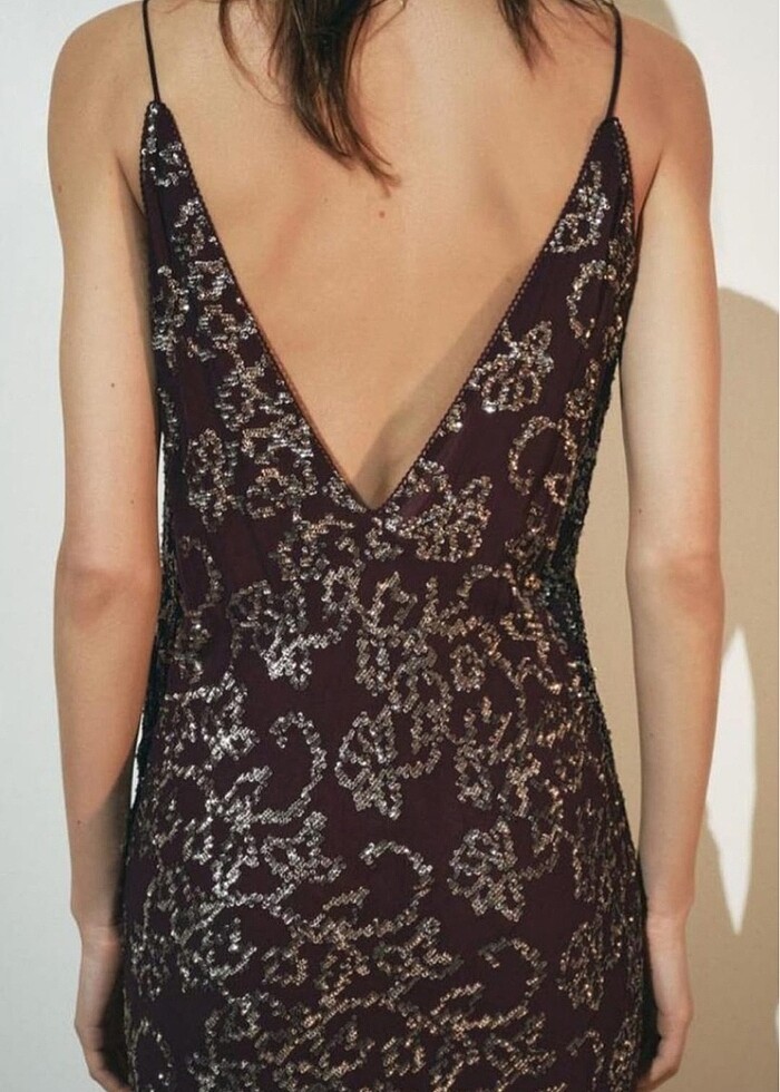 Zara pullu elbise. İnce askılı ve V yakalı lingerie stil elbise. Pul aplikeli. Kloş etekli #yeni#etiketli#pullu#bordo#mürdüm#mor#rengi#uzun#elbise#zara