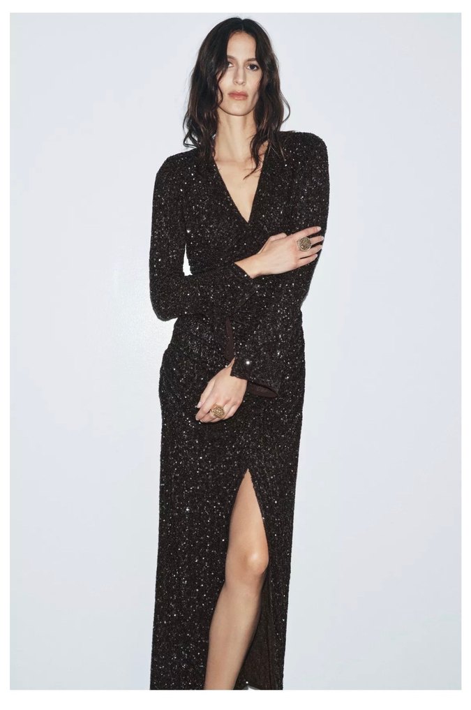 Zara Pullu Siyah Uzun Kollu V Yaka Elbise