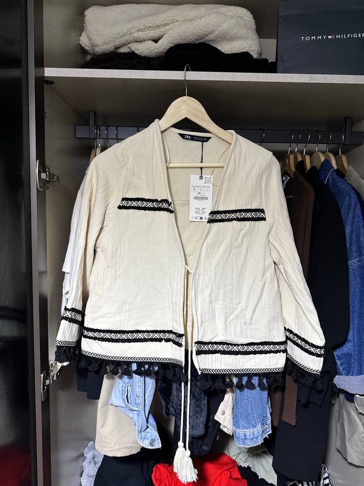 Zara Pamuklu, nakışlı ve püsküllü detaylara sahip bol kesim, uzun kollu bohem kadın ceket. yaka ve kol detaylı midi boyda, açık beyaz renktedir. Sıfır ve etiketlidir