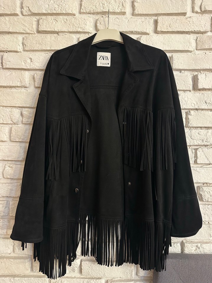 Siyah süet kumaştan, uzun kollu, notalı yaka ve püskül detaylı kadın ceketi. Normal kesim ve günlük kullanım için uygun. Bir kere giydim.