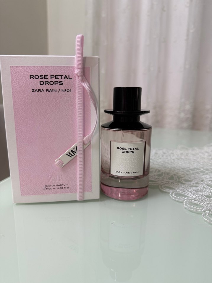 Zara Rain Rose Petal Drops, siyah kapaklı şişede yumuşak gül kokusuna sahip kadın parfümüdür. Pembe kutusunda kurdele detayı bulunur.