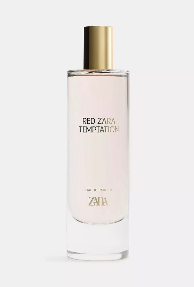 Zara Red Temptation kadın parfümü, şeffaf şişe ve altın kapakla sunulur, narin ve çekici bir koku sağlar.
