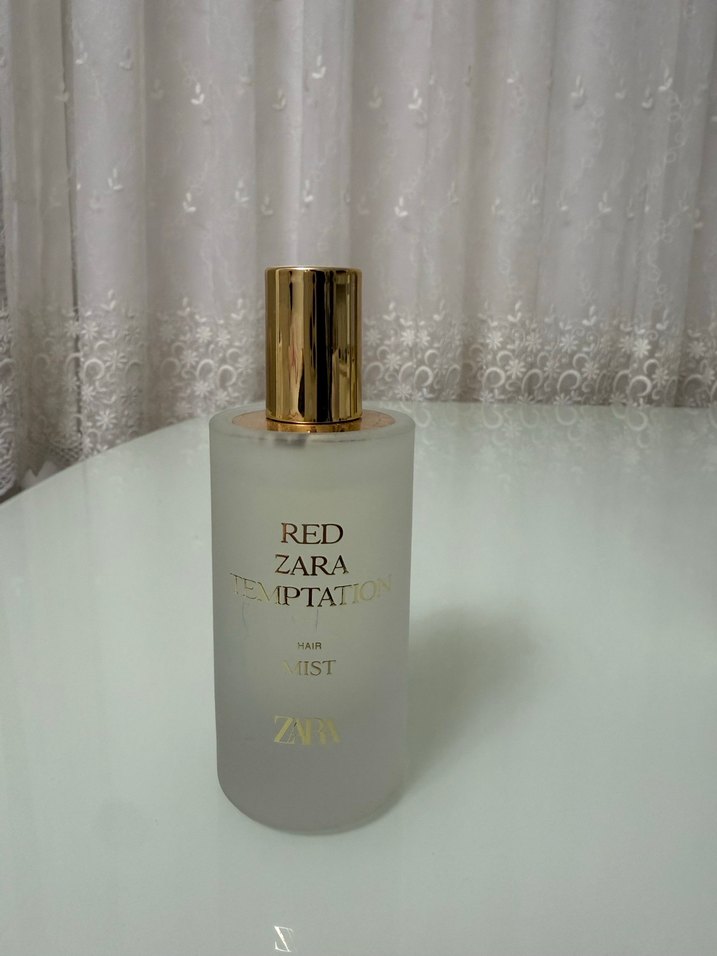 Zara Red Temptation kadınlar için saç spreyi, zarif kokulu ve altın kapaklı mat cam şişede sunulur.