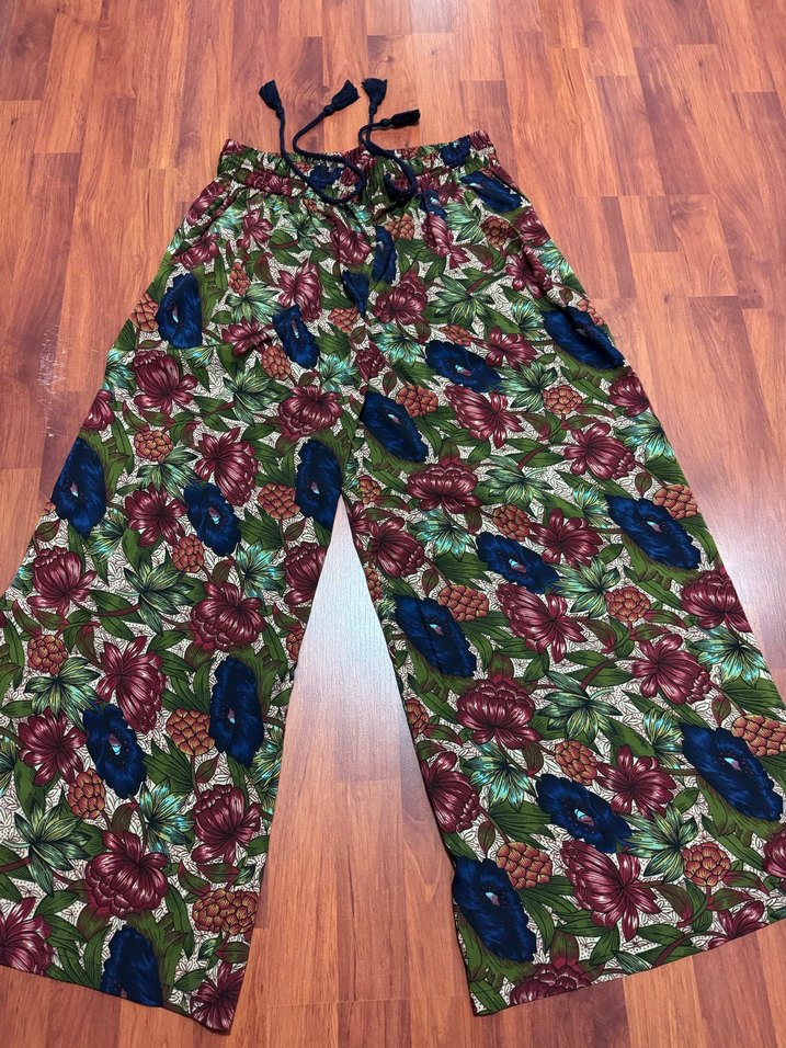 Renkli tie-dye çiçek desenli, bol kesim uzun kadın pantolonu. Sentetik kumaştan, düğmeli ve ayarlanabilir bel detaylı. Günlük kullanıma uygun.