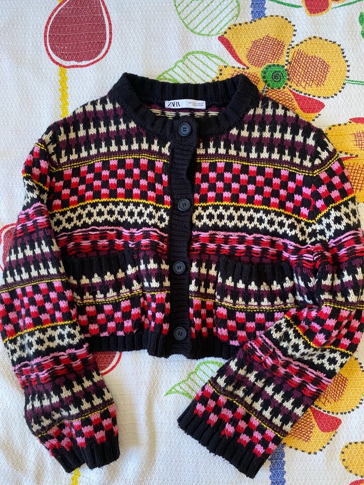 Renkli, uzun kollu ve bol kesim örgü hirka, canlı desenleriyle dikkat çekiyor. Birkac defa giydim, sicak tutuyor